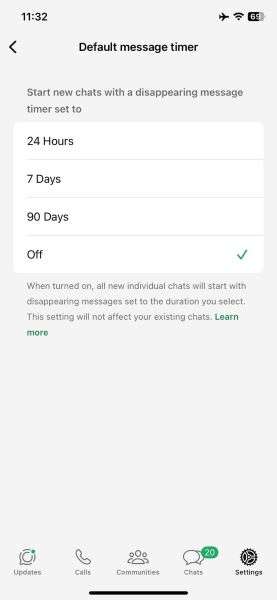 This option works differently from View Once WhatsApp; the chats do not vanish but remain visible until the set limit is reached. Users can choose a time frame based on their preferences, such as 24 hours or 90 days. In the absence of the view once feature of text messages, these disappearing messages emerge as a valuable alternative for temporary conversations.