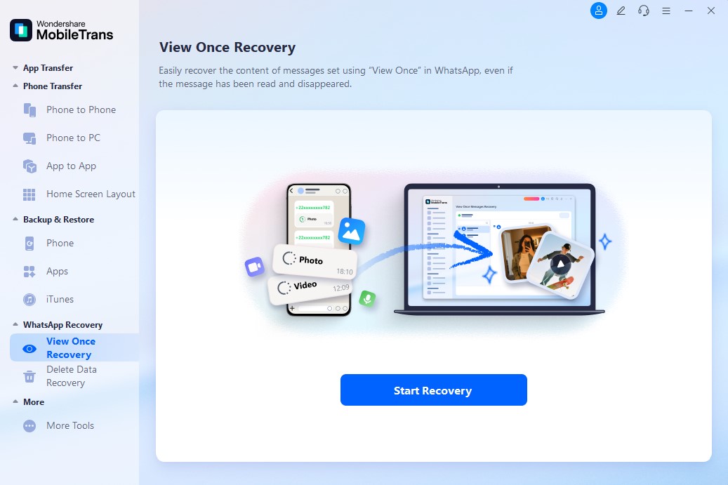 Launch the MobileTrans software and click on WhatsApp Recovery > View Once Recovery. Hit Start Recovery and connect your WhatsApp account as instructed.