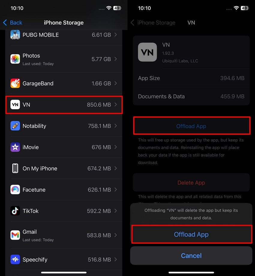 Step 2. Select an app, press the “Offload App” button, and hit the “Offload App” option again.