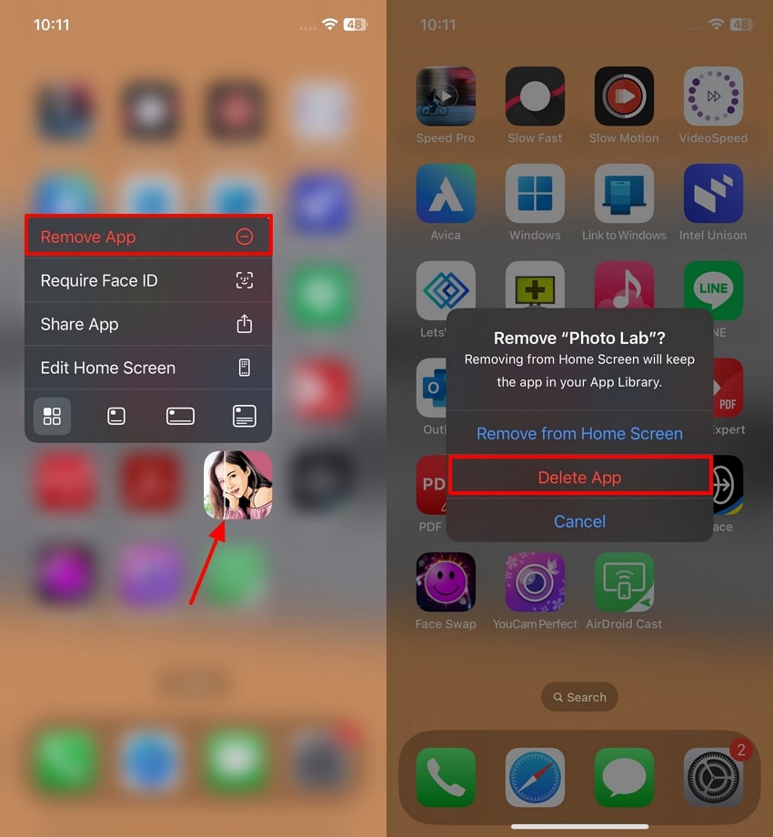 Step 1. Press and hold the app icon and tap the “Remove App” option. Confirm by selecting the “Delete App” option.