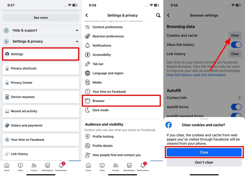 Instructions. Go to the “Settings” feature and hit the “Browser” option. Tap the “Clear” button next to the “Cookies and Cache” option and hit the “Clear” button.