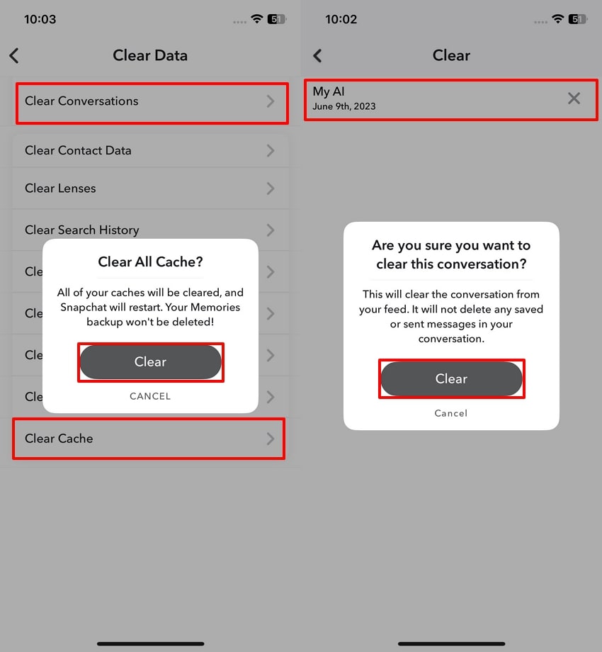 Step 2. Tap the “Clear Cache” option and the “Clear” box for confirmation. Press the “Clear Conversations” option and select a conversation. Confirm by hitting the “Clear” button.