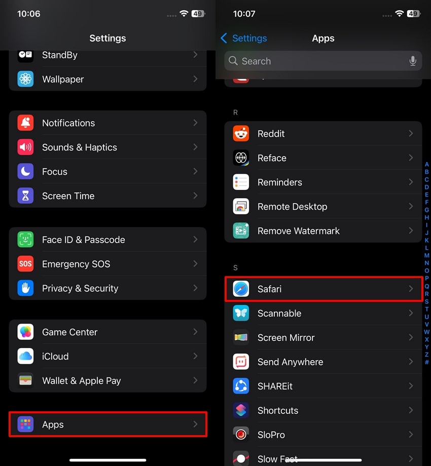 Step 1. In the “Settings” app, find the “Apps” option and select “Safari.”