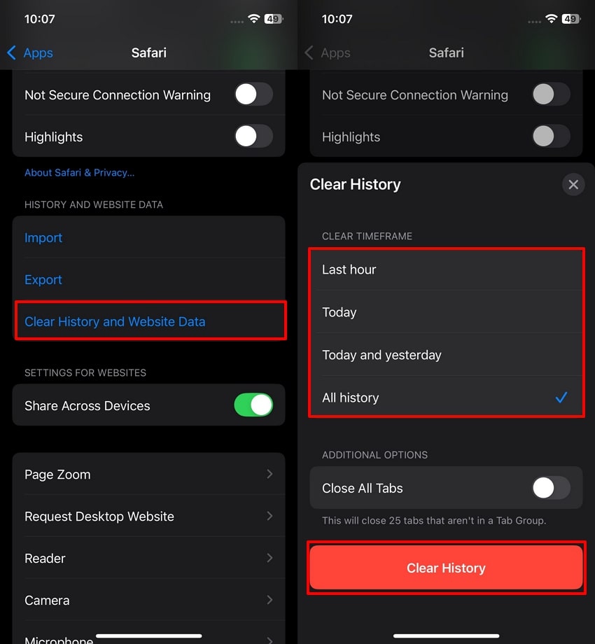 Step 2. Hit the “Clear History and Website Data” option, select a time duration, and press the “Clear History” button.