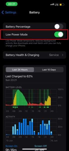You'll notice that the Low Power toggle turns green, and your battery icon will change to yellow.