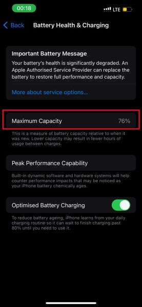 If the maximum capacity is under 85%, consider servicing or replacing the battery.