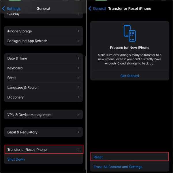 Scroll down and tap "Transfer" or "Reset iPhone." Then select Reset.