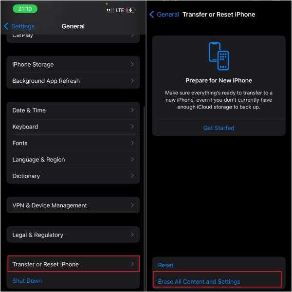 Scroll down to 'Transfer or Reset iPhone' and tap 'Erase All Content and Settings'.