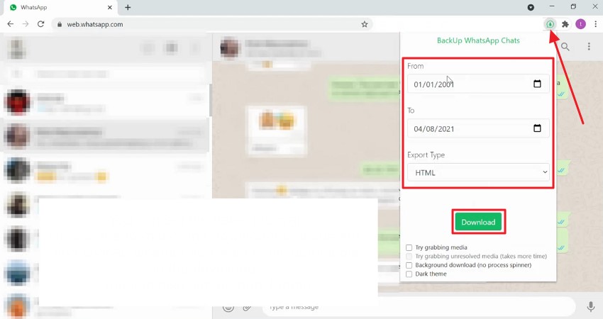 Step 3. Open WhatsApp Web > Locate and click extension > Specify "Date" and "Export Type." Hit "Download" after configuring the setup.