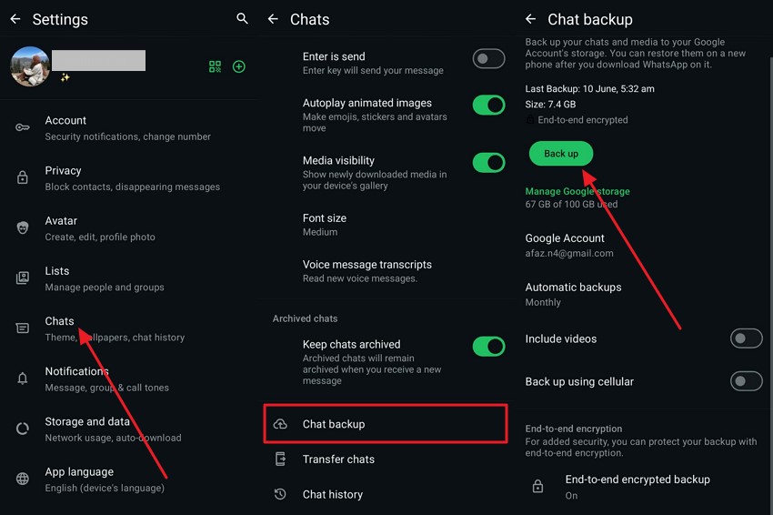 Instructions. Access the "Chat" after clicking on the app’s settings. Locate "Chat Backup" > "Backup."