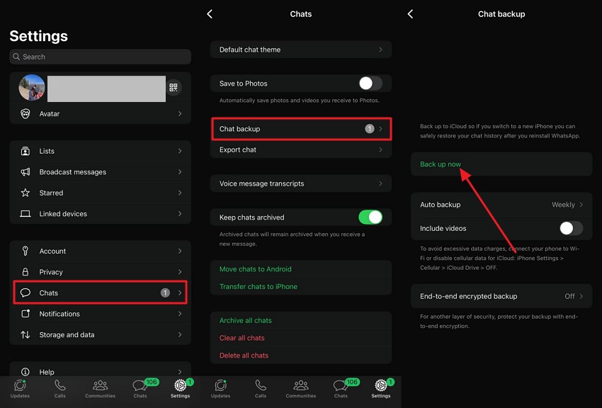 Instructions. Enable WhatsApp "Settings" and click on "Chats." Press "Chat Backup" > "Backup Now" to start backup instantly.