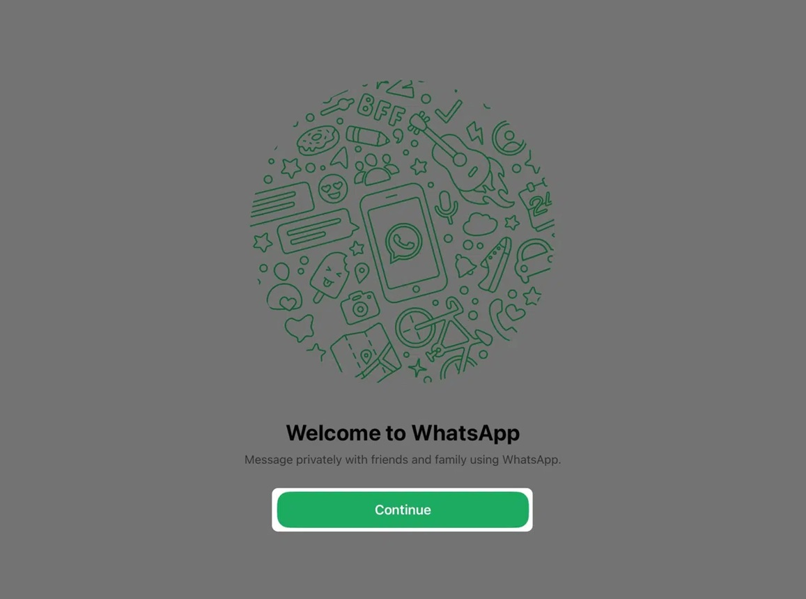 Open the WhatsApp app on your iPad. The app will show a welcome screen first. Tap "Continue" to accept the terms.