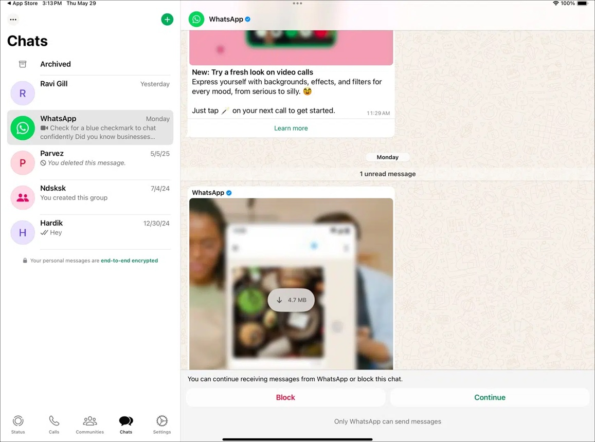 The app takes advantage of iPad-specific features, such as drag and drop, allowing you to easily transfer photos from other apps into WhatsApp for quicker sharing. Additionally, split-screen multitasking lets you chat while using other apps simultaneously.