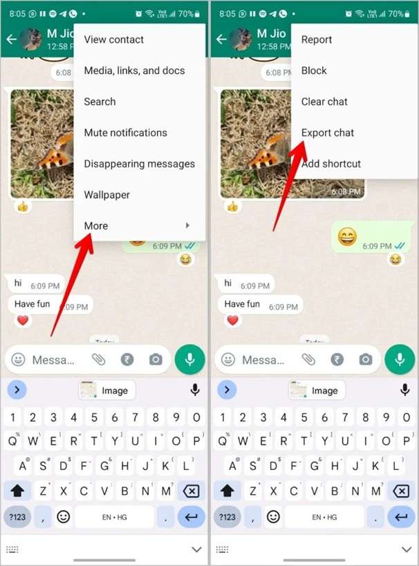 Step 1. Launch WhatsApp on your Android device. Go to the chat you wish to print. Tap the three-dot menu at the top, select More from the dropdown, and then choose Export chat.