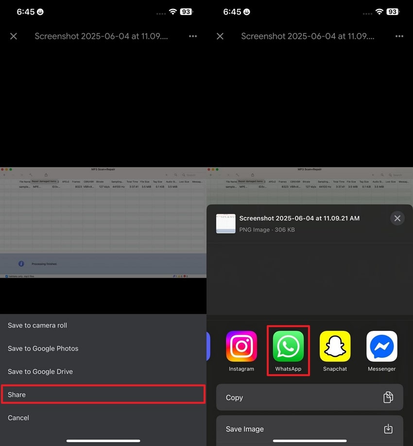 Step 2. Access received email on iPhone and press "Three Dots." Choose the "Share" option and select WhatsApp > Specify the Chat to send the photo.