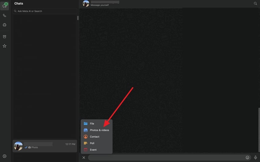 Step 1. Choose the "Linked a Device" option and scan the QR code on WhatsApp Desktop Mac. Open chat for someone and press the "+" icon to select the "Photo & Videos" option.