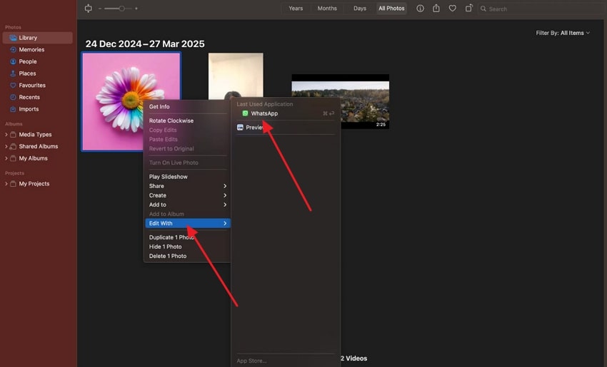 Photos stored in the macOS Photos app can be edited and organized, but they aren't directly accessible when attaching files. To work around this, you can choose the Edit With option and send a picture via WhatsApp to any chat you prefer. For a practical overview, follow the given tutorial to share photos from Mac to WhatsApp:
